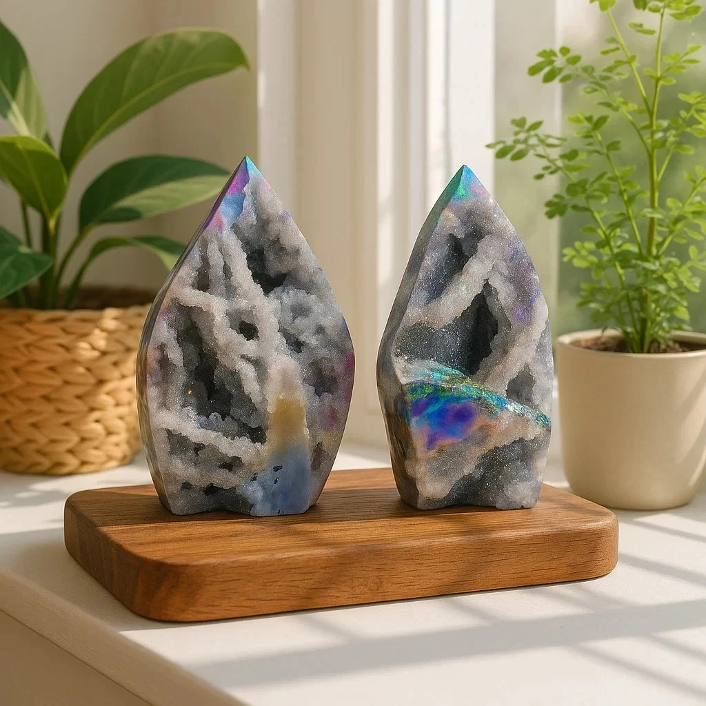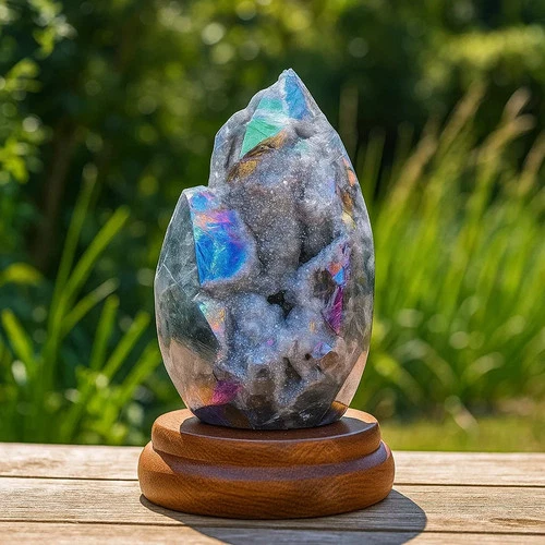 This Rare Angel Aura Sphalerite Flame Tower was created to bring that uplifting energy into your home. Angel Aura treatment enhances the natural beauty of sphalerite, creating shimmering rainbow iridescence that feels both magical and grounding. The flame tower shape channels energy upward, making it an ideal piece for meditation, healing practices, or simply adding a radiant touch of elegance to your space.