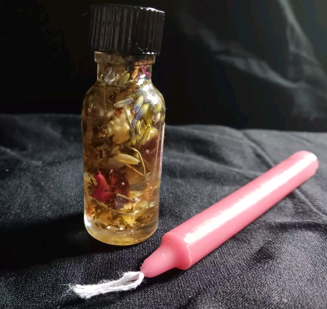 My COME TO ME Oil is made in a Master Bottle and allowed to steep for 4 to 6 weeks while a blessing of intention is spoken over it daily. It is made of powerful herbs such as Damiana, Hibiscus, Catnip, Rose, Essential Oils of Dragon’s Blood, Jasmine and other potent herbs and essential oils.