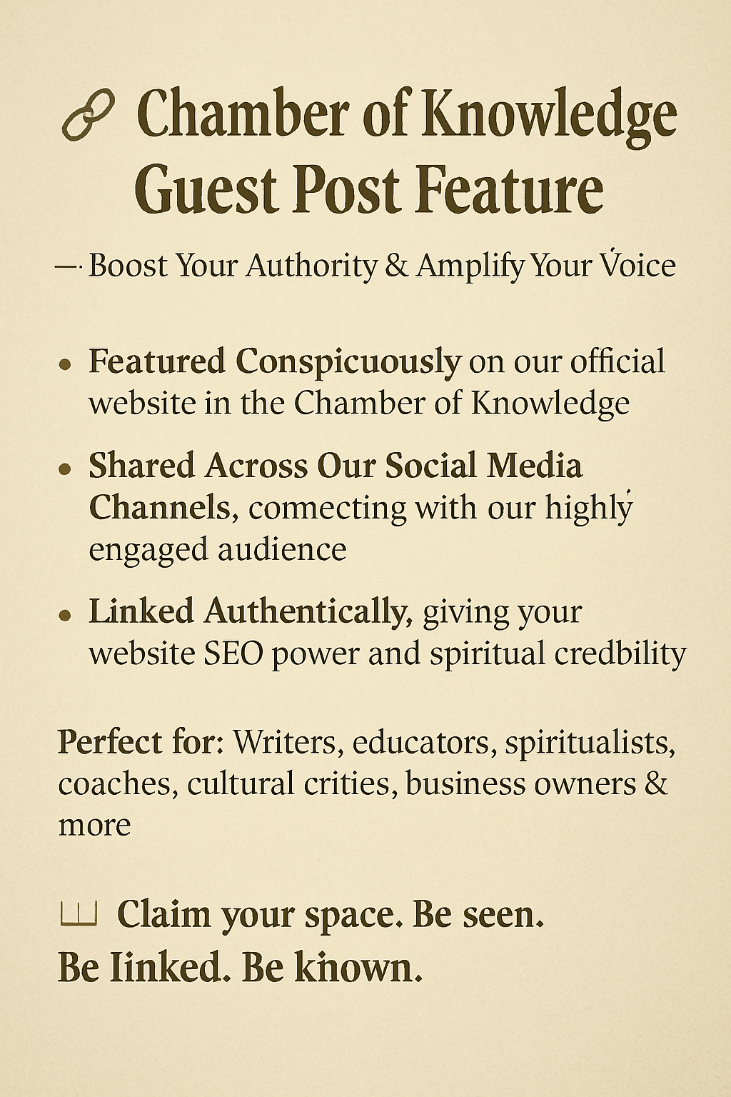 Step into the sacred halls of the Chamber of Knowledge, where wisdom is currency and alignment is strategy. With our Guest Post Feature listing, your voice doesn’t just echo—it resonates.