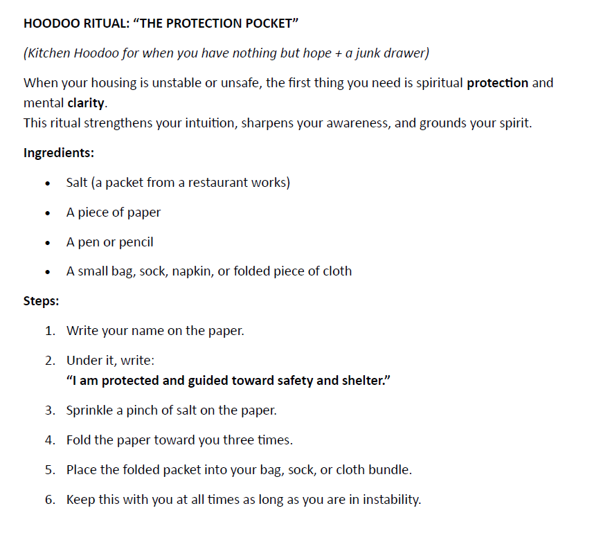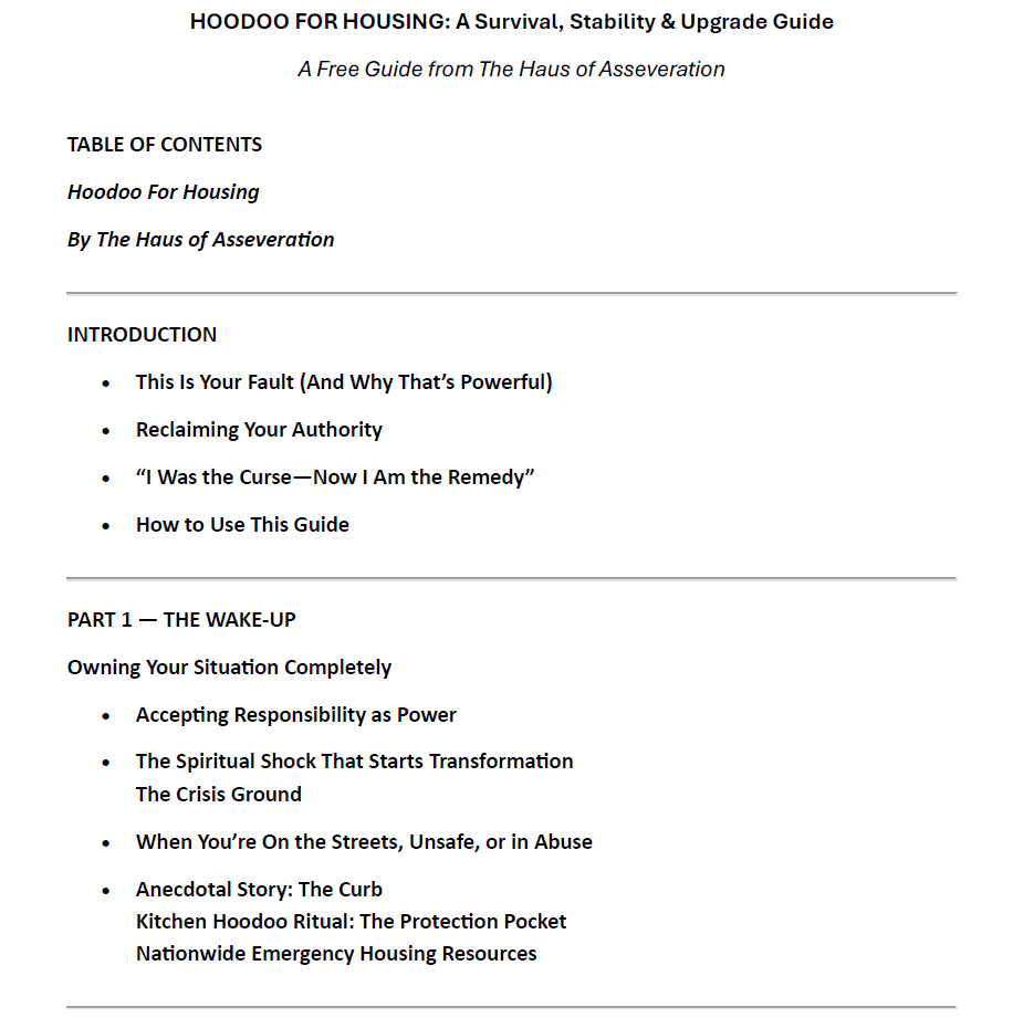 Hoodoo For Housing is a free, powerful guide blending kitchen-table Hoodoo rituals with real-life housing resources, eviction strategies, homelessness support, and nationwide programs. Perfect for anyone facing housing instability or rebuilding their life. Download instantly.